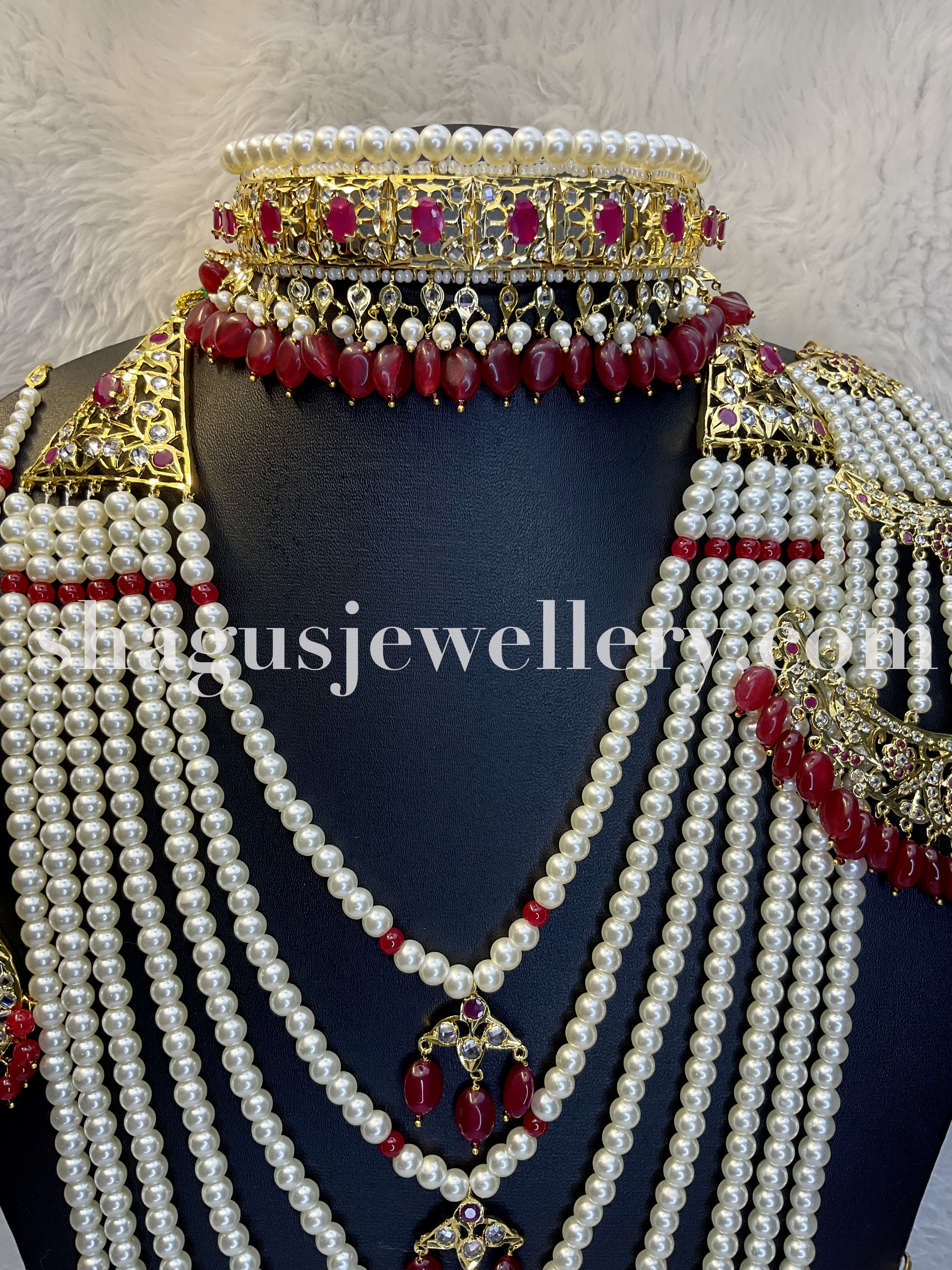 Glimpses of royalty and grandeur abound in this enchanting Indian bridal jewelry set. Crafted with meticulous attention to detail, the 22-karat gold-plated set features an exquisite combination of red beads and pearls, culminating in a mesmerizing seven-layered satlada necklace that will leave you breathless. The lavishness continues with the magnificent jhumkas, the gorgeous jhoomar, and the dazzling maang tika, perfectly complementing the choker or jadavi which completes the set. As you gaze upon this masterpiece, get ready to be transported to a world of opulence and magnificence fit for a queen.”