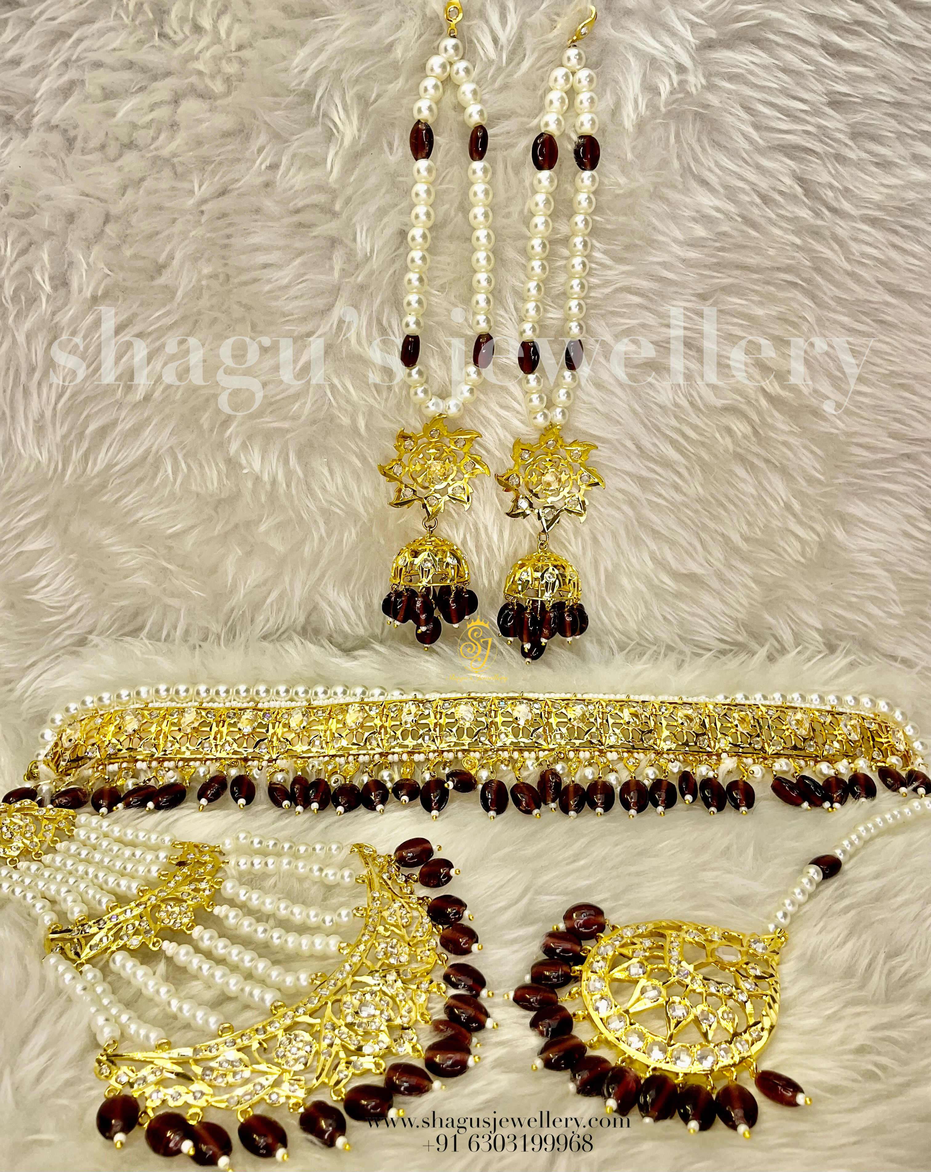 Enchanting Grandeur: Indulge in the opulence of this maroon and 22-karat gold-plated Jewellery set adorned with beautiful pearls. Esteemed as a purple Jadavi Dulhan set, it exudes an air of regal splendor. The centerpiece comprises a breathtaking polki Jadavi choker, elegantly complemented by a perfectly sized maang tikka, a captivating jhoomar, and a pair of exquisite Taana-styled jhumkas. Let this ensemble grace your special occasion, radiating timeless charm and lavish sophistication in every step!
