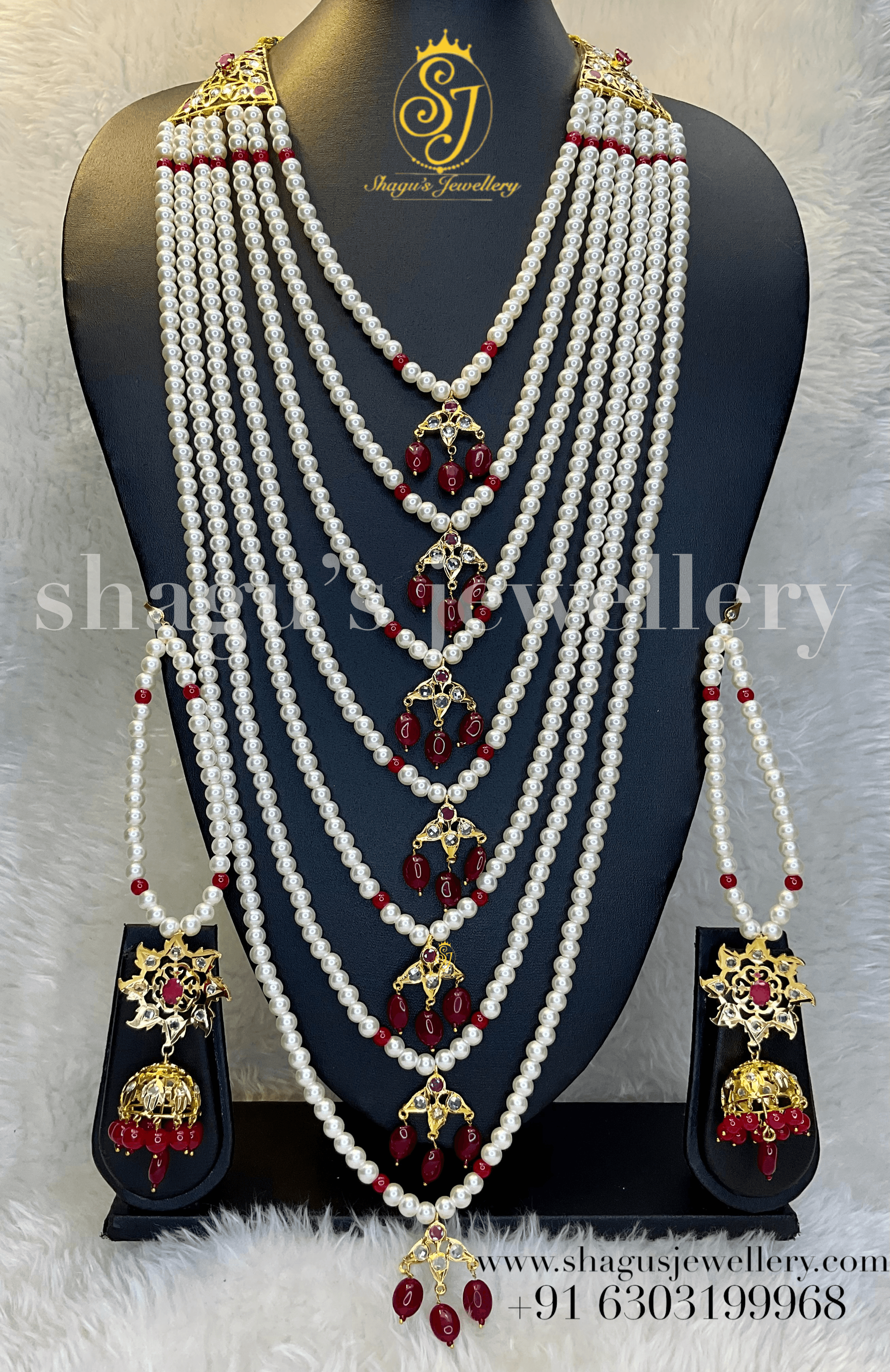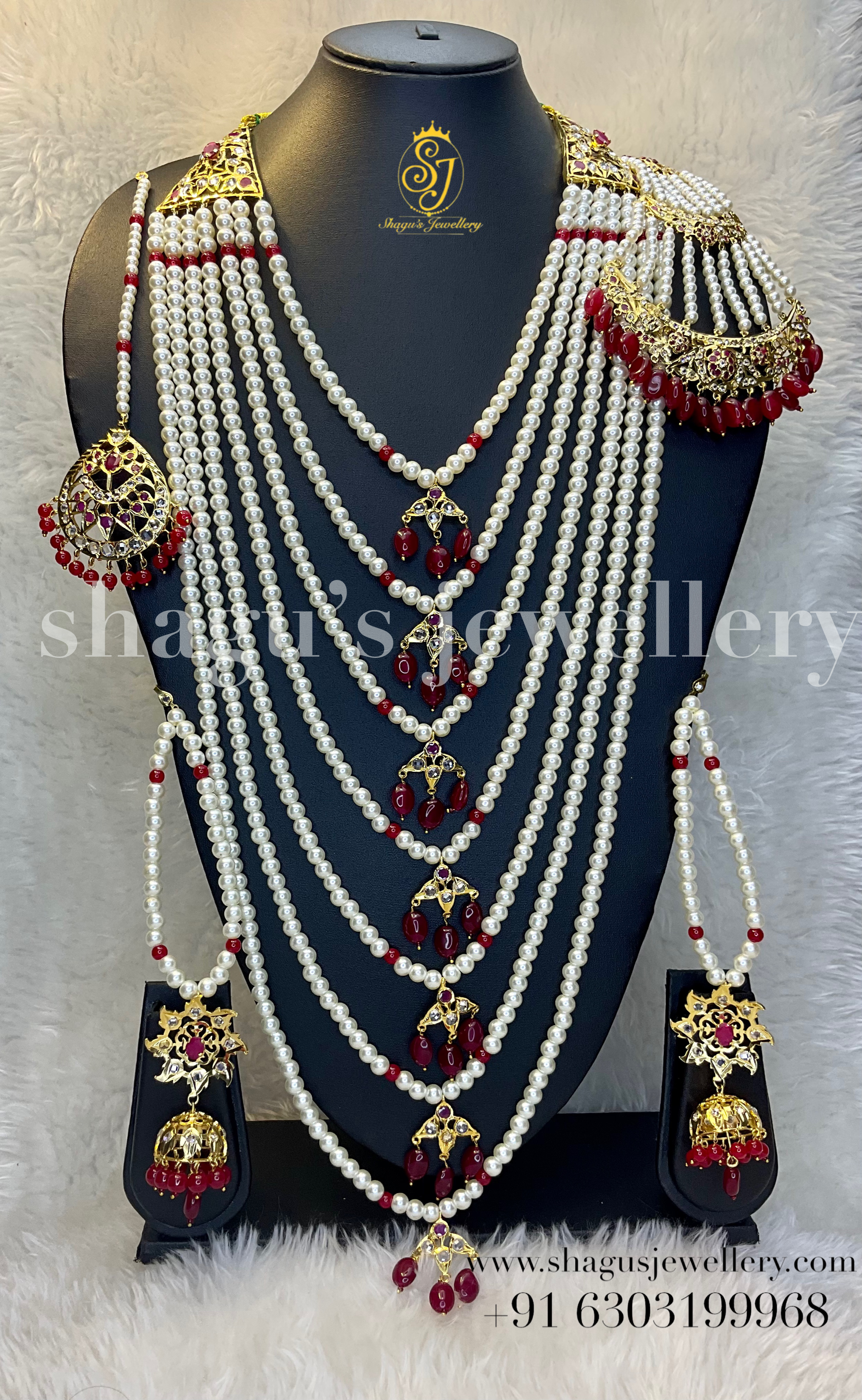 Majestic Splendor: Immersed in the Opulence of Dulhan Satlada is 22K gold plated. Behold the breathtaking beauty of this Indian bridal jewelry set, resplendent with radiant pearls and exquisite red beads. The centerpiece of this ensemble is the awe-inspiring 7-layered satlada, gracefully draping the bride’s neck with layers of timeless elegance. Accentuating her regal allure, the maang tika gracefully adorns her forehead, while the mesmerizing jhoomar adds a touch of ethereal charm. With every sway, the enchanting pair of jhumkas sparkles, encapsulating the essence of bridal radiance. Discover a world where tradition meets magnificence, inviting you to embrace a journey of absolute magnificence and eternal love.
