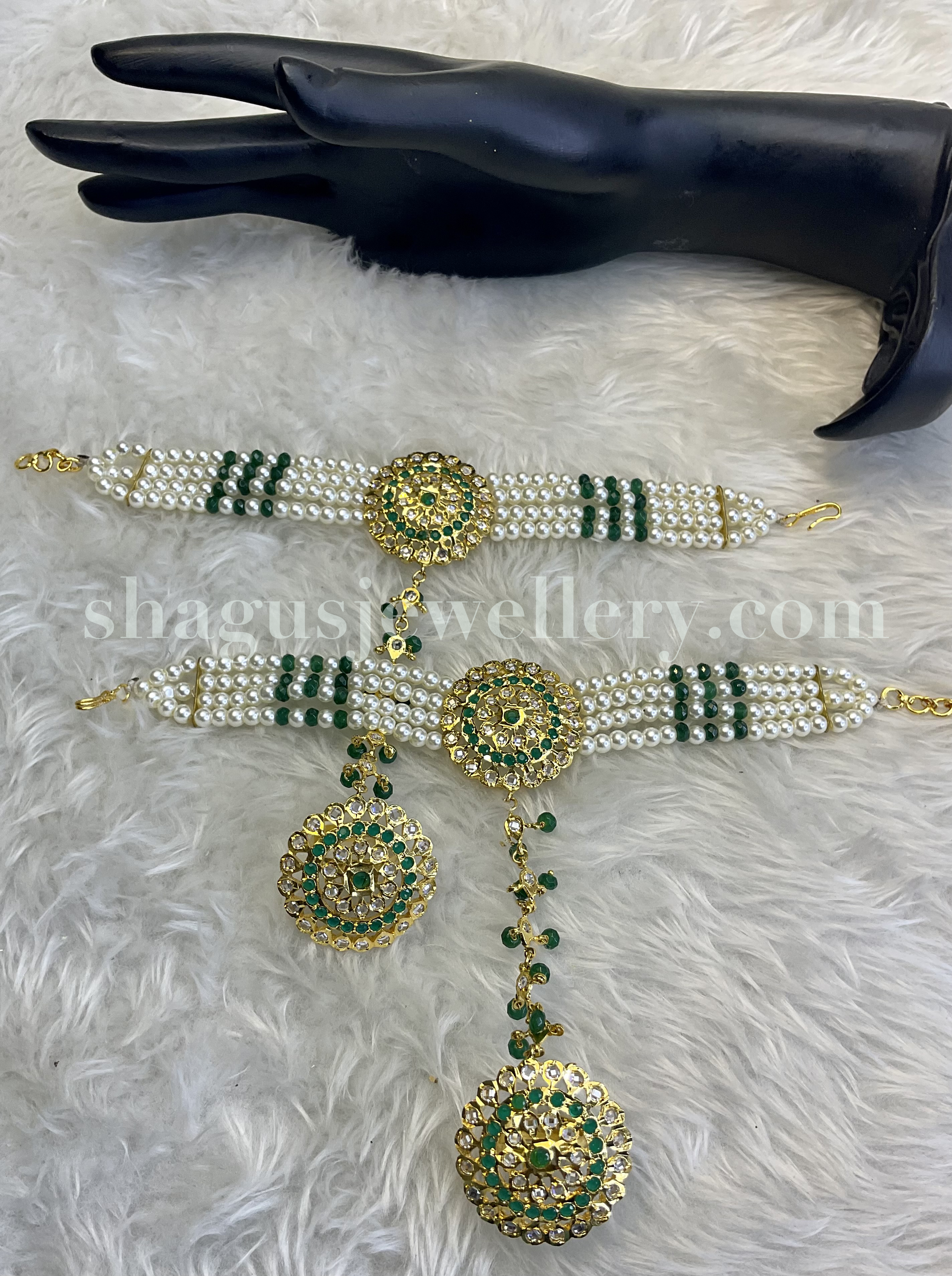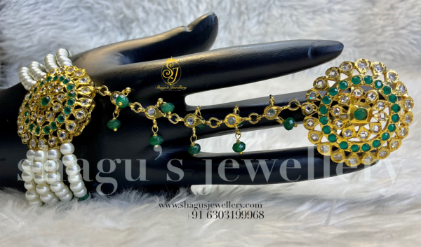 Adorn your hands with the exquisite allure of the emerald and pearl haath phool bangle set, a symbol of absolute beauty and grace! Product Description: Elevate your style with the mesmerizing emerald and pearl haath phool bangle set. Designed to grace your hands with elegance, this set features intricately crafted gold bangles adorned with vibrant green emeralds and delicate pearls. Each bangle intertwines flawlessly, creating a mesmerizing piece of wearable art. Simply slip on these haath phools to instantly elevate any outfit, whether it be for a traditional ceremony or a special occasion. Let the beauty and grace of the emerald and pearl haath phool bangle set become an extension of your innate elegance.