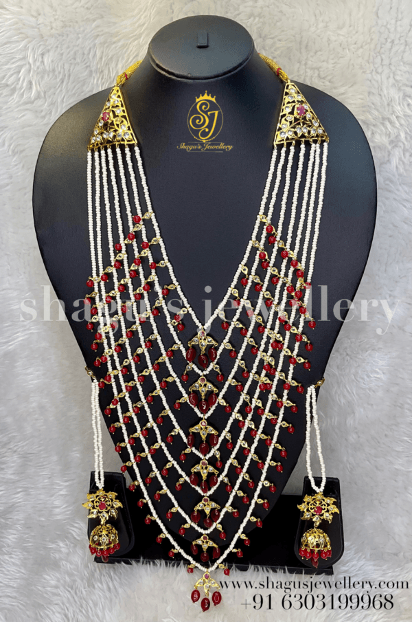 Step into a world of opulence with this exquisite necklace set. Crafted with intricate artistry, this grandiose ensemble captures the essence of royalty. The Lucknowi satlara set, lavishly embellished with gleaming 22k gold plating, is adorned with a striking combination of ruby red beads and lustrous white pearls. Its seven-layer design gracefully cascades, exuding a regal aura fit for a queen. The pièce de résistance lies in the magnificent jhumka, elegantly dangling from the set, reflecting the grandeur of traditions. Whether it’s for a bridal occasion or a glamorous party, this necklace set simply radiates magnificence and allure.