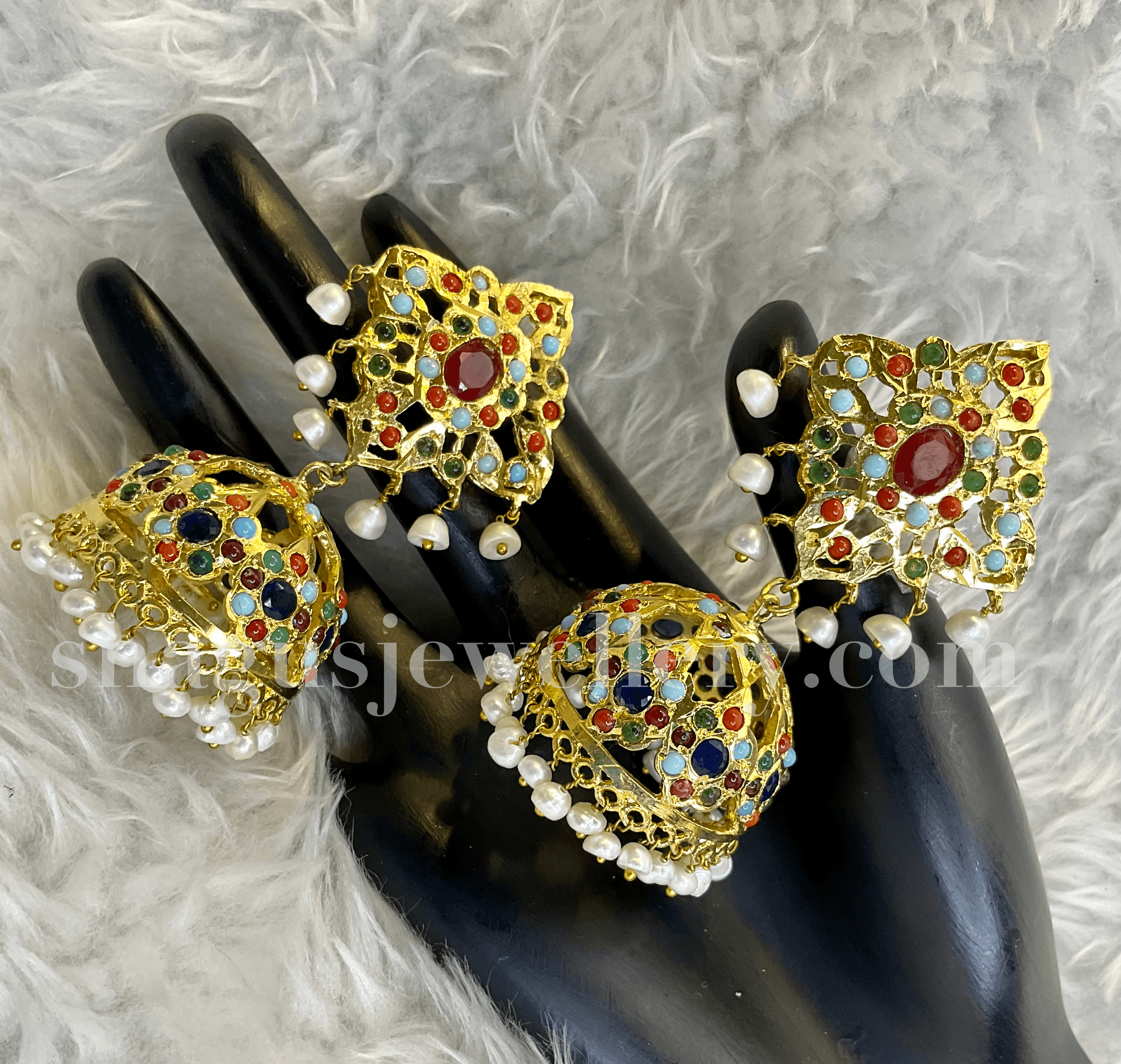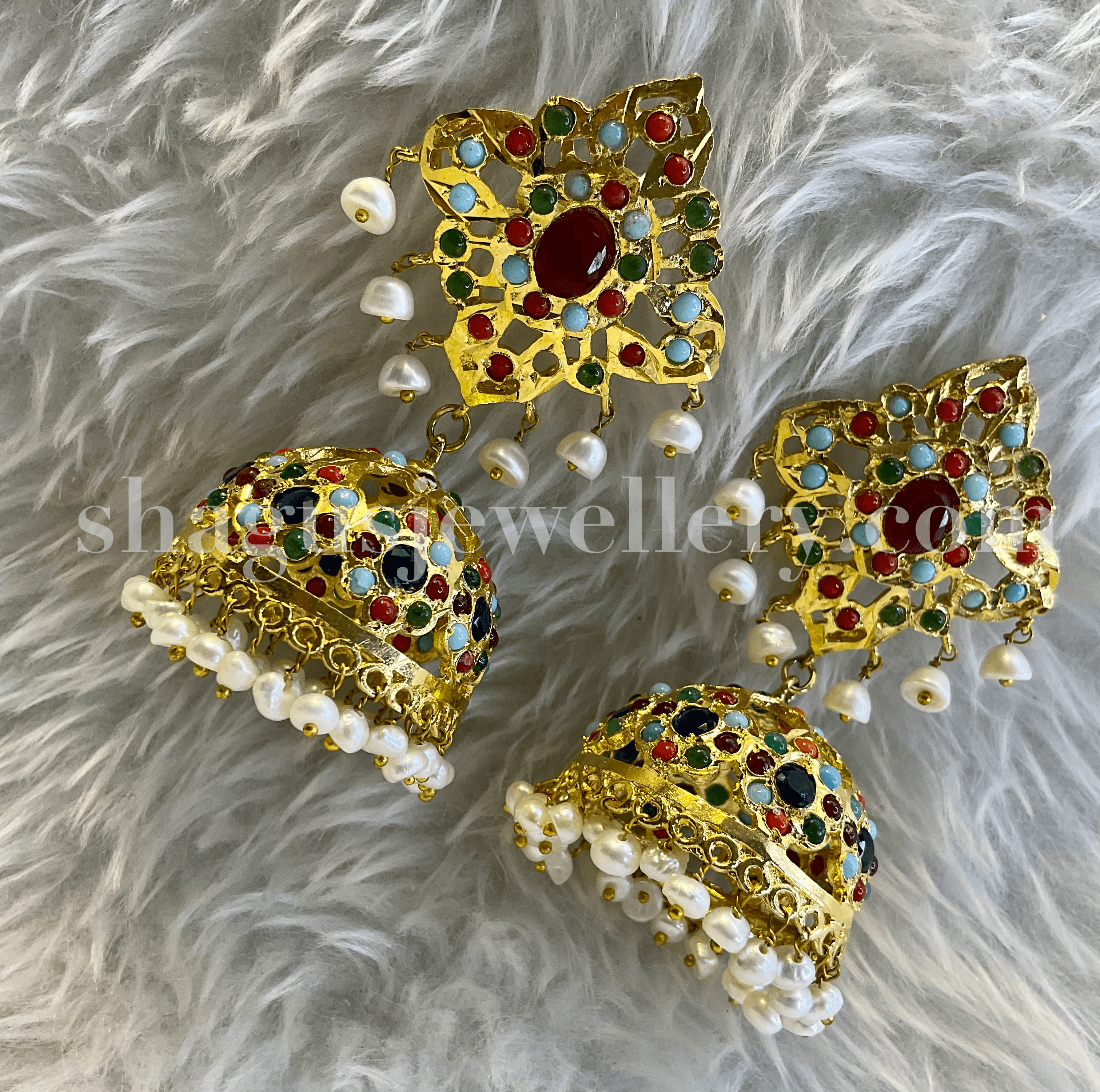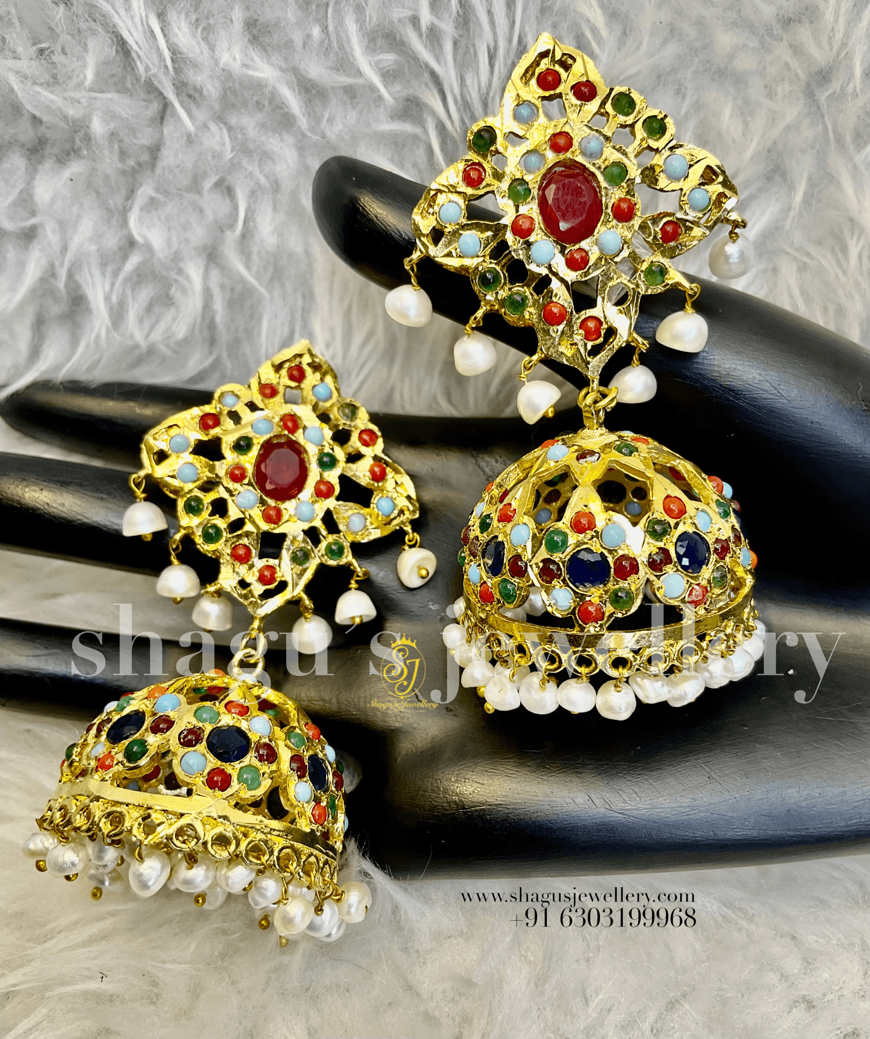 22k gold plated dazzling pair of golden jhumka earrings that embody elegance and charm. These exquisite jhumkas with their intricate design capture the attention with their stunning beauty. Adorned with real pearls and adorned with navratan precious stones, they effortlessly blend tradition with contemporary style. Perfect for both special occasions and everyday wear, these statement earrings exude sophistication and grace. Embrace a touch of luxury and make a lasting impression with these handcrafted masterpieces that elevate any ensemble to new heights.