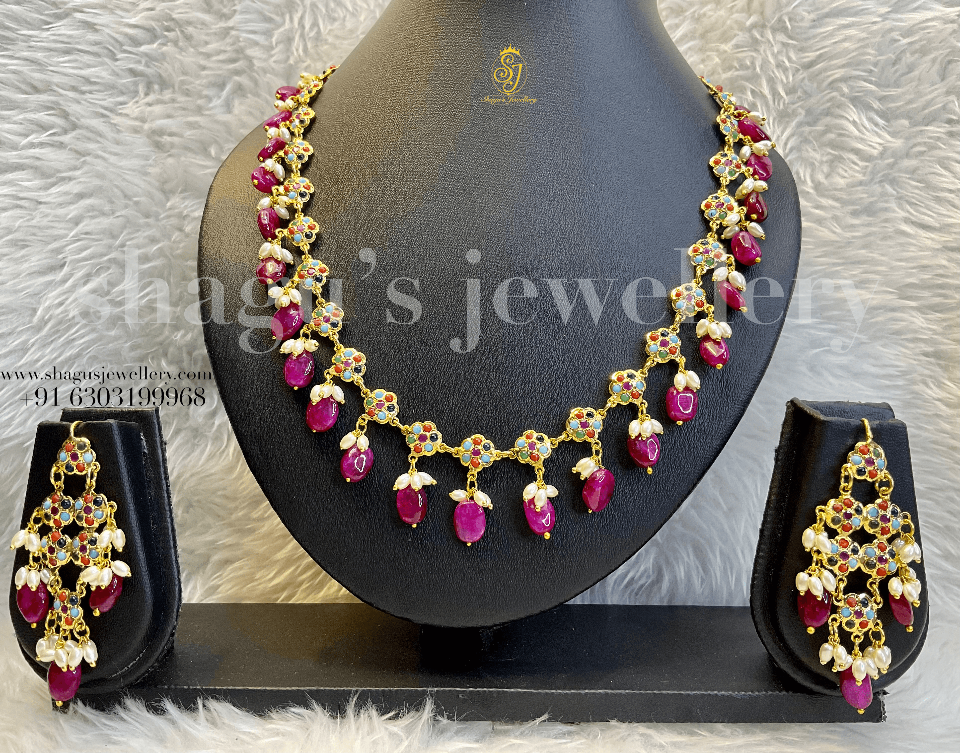 Adorn yourself in this stunning Navratan pink pearl necklace set adorned with real rubies! The intricate design of this necklace and earring set beautifully showcases the real pearls and rubies in a magnificent arrangement that adds a touch of sophistication to any outfit. The pink hue warms the skin, while the Navratan design adds an exotic flair. This necklace set is perfect for special occasions and will easily become a valuable addition to your jewelry collection. Be mesmerized by the exquisite craftsmanship and elegance of this charming Navratan pink pearl necklace set adorned with real rubies.