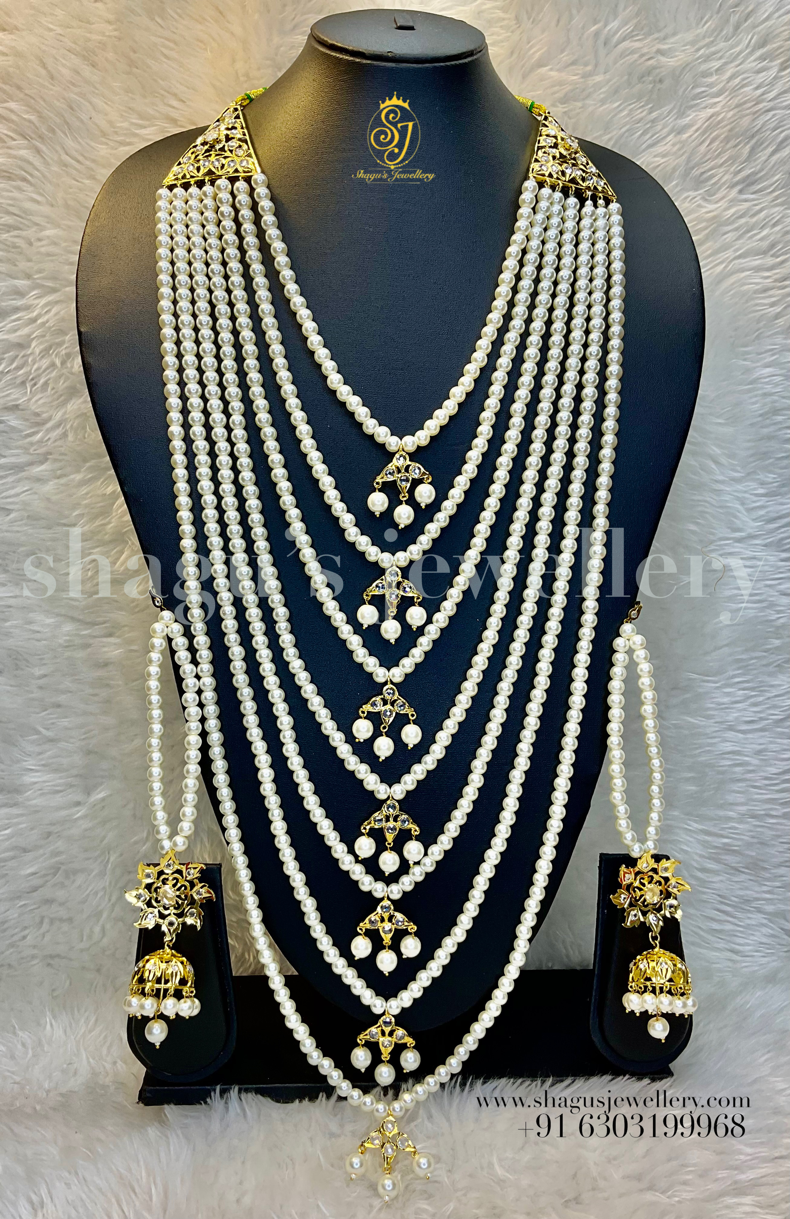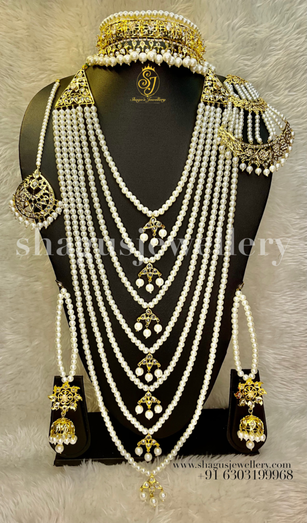 Embodied Elegance: Unveiling the Regal Charms of Lucknowi Heritage. Product description: This captivating ensemble of Bridal Dulhan set echoes the grandeur of Nawabi opulence with its 7 layered Lucknowi satlada, resplendent with pearls and exquisite craftsmanship. Adorned with a dazzling jhoomar, an extraordinary semi-precious stones studded jadavi choker, a mesmerizing perfectly sized maang tika, and a pair of graceful, traditional dangling jhumkas, this timeless collection narrates tales of a bygone era. Be the Queen of your special day by stepping into an ethereal world, where tradition meets allure, and experience the allure of ancient grace entwined with contemporary finesse.