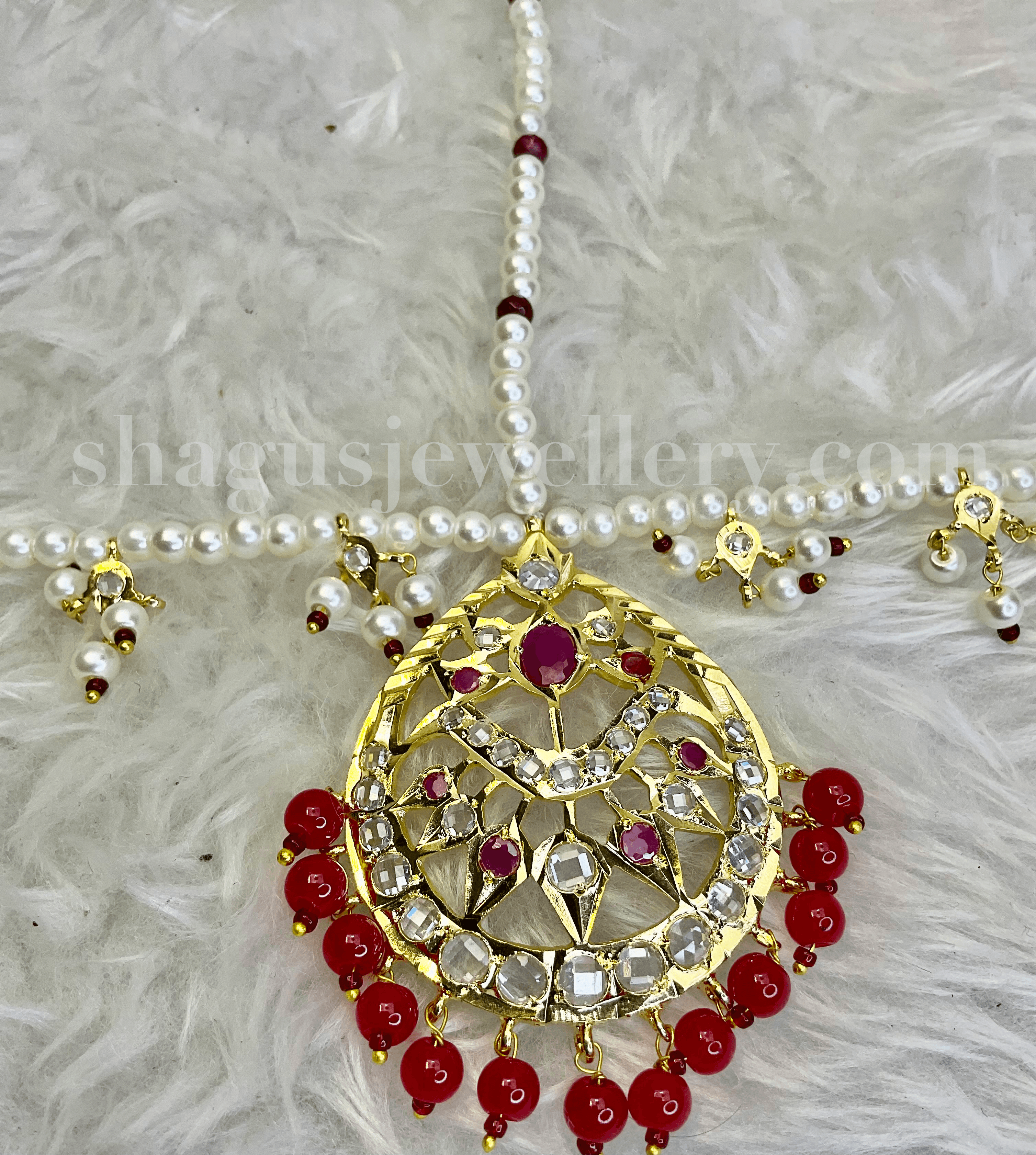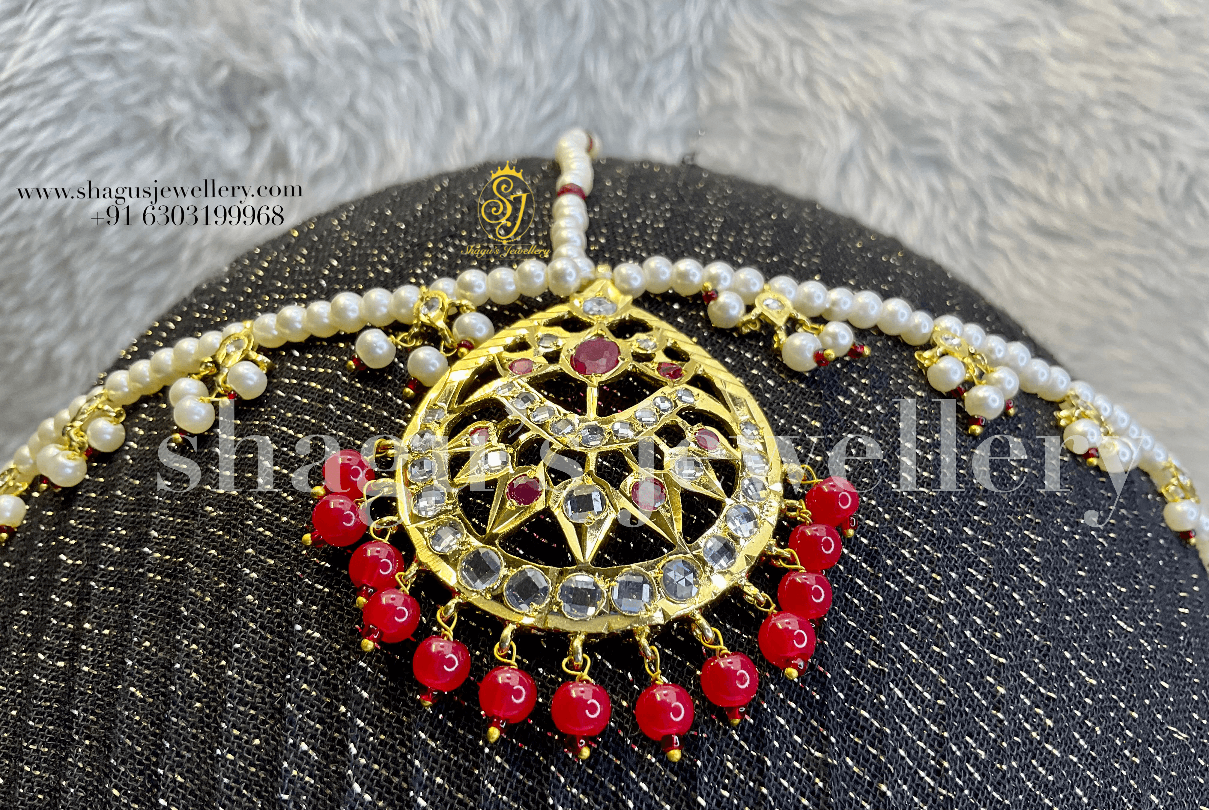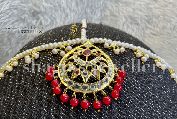 22k gold plated mathapatti beholds the enchanting beauty of this ruby red stones and pearls, a true masterpiece in jewelry artistry. This regal hair accessory is meticulously crafted, boasting a finish that adds a touch of opulence. Its captivating red stones are skillfully set alongside glistening white pearls, forming a harmonious symphony of colors. Delicate and alluring, this necklace is fit for a princess, exuding a sense of grace and elegance. Asymmetrically designed, it effortlessly embraces mathapatti evoking a sense of royalty and sophistication. Whether worn by a bride on her wedding day or by any precious soul on a special occasion, this jewellery is sure to make a lasting impression.