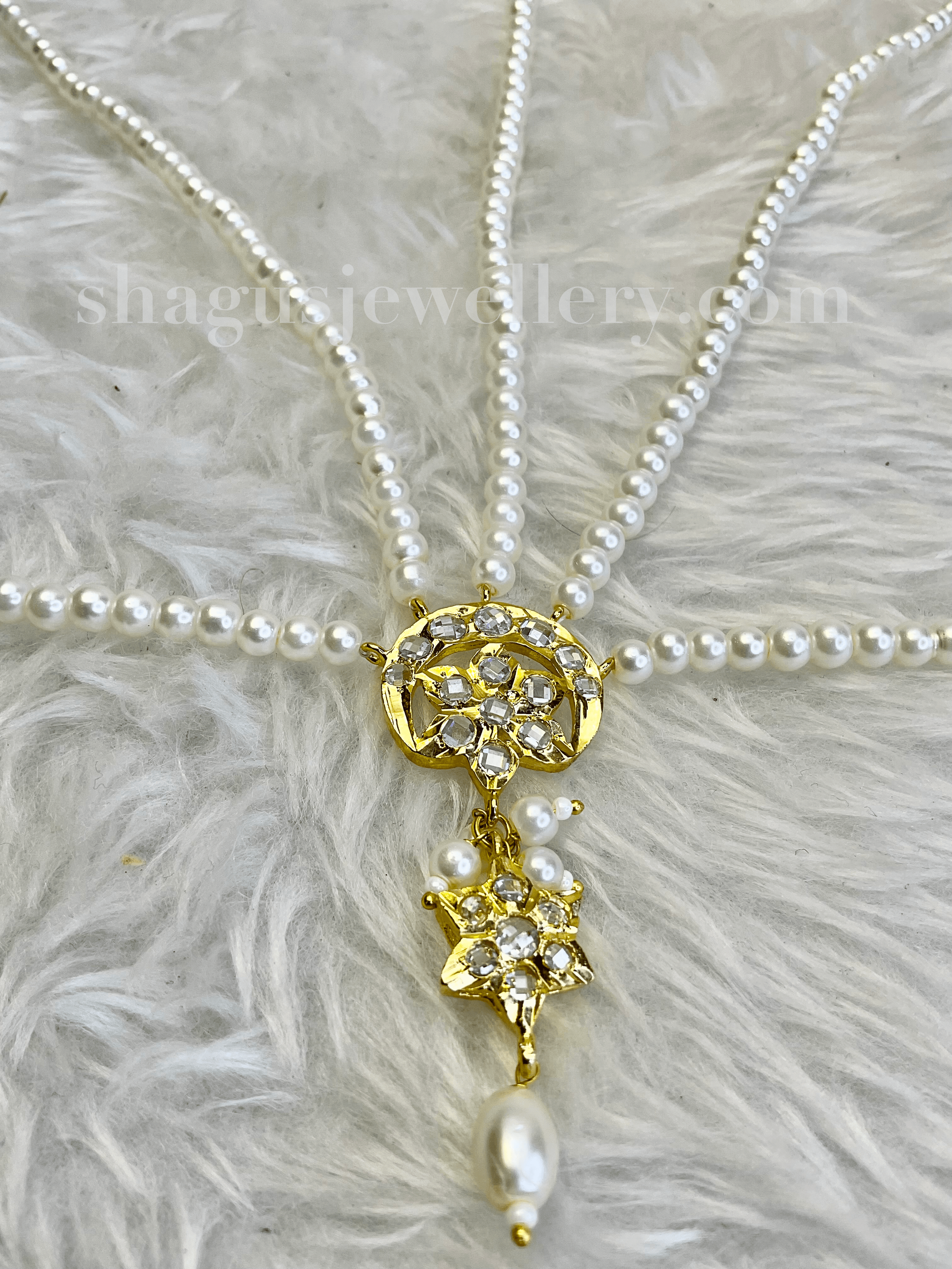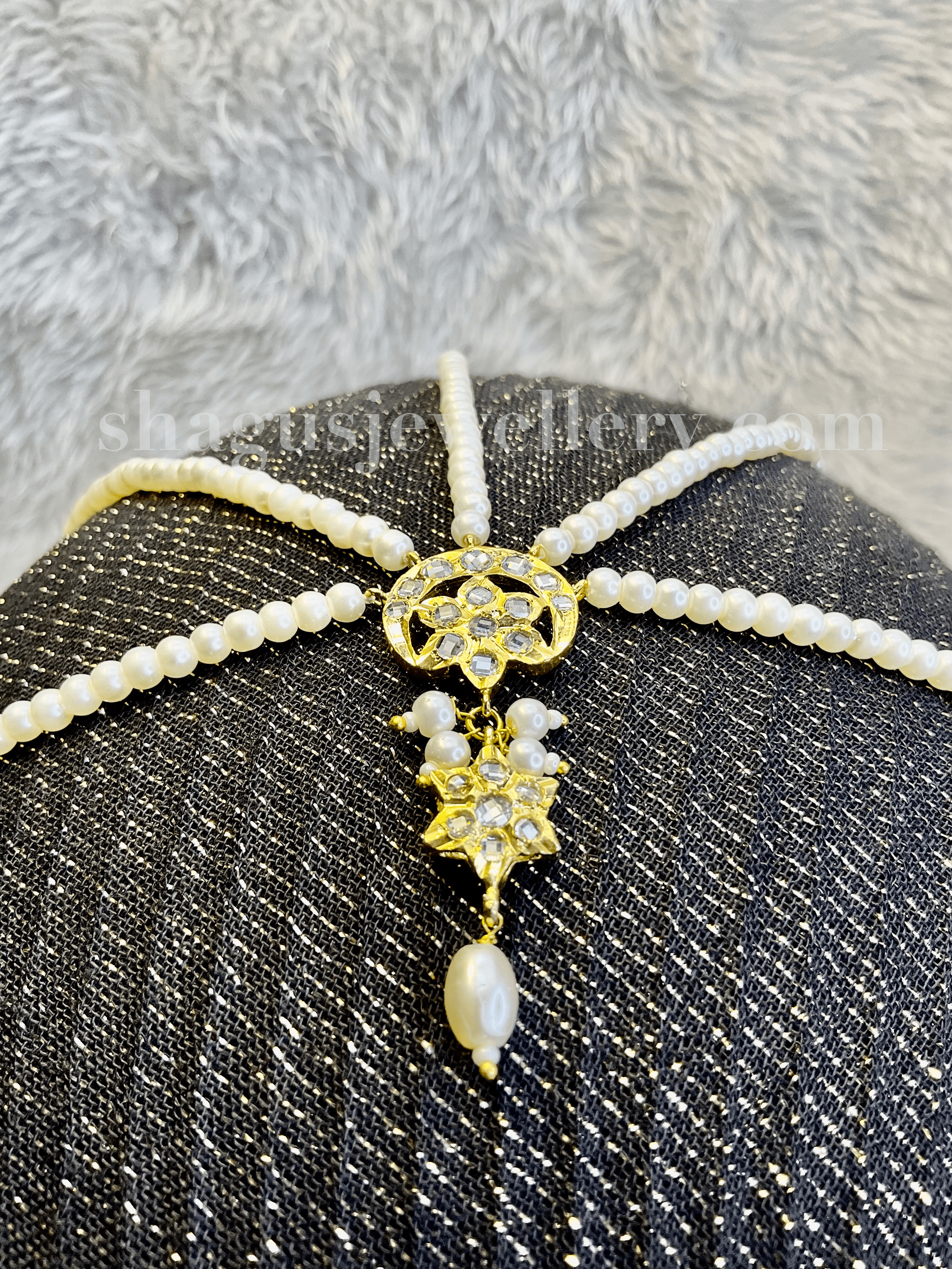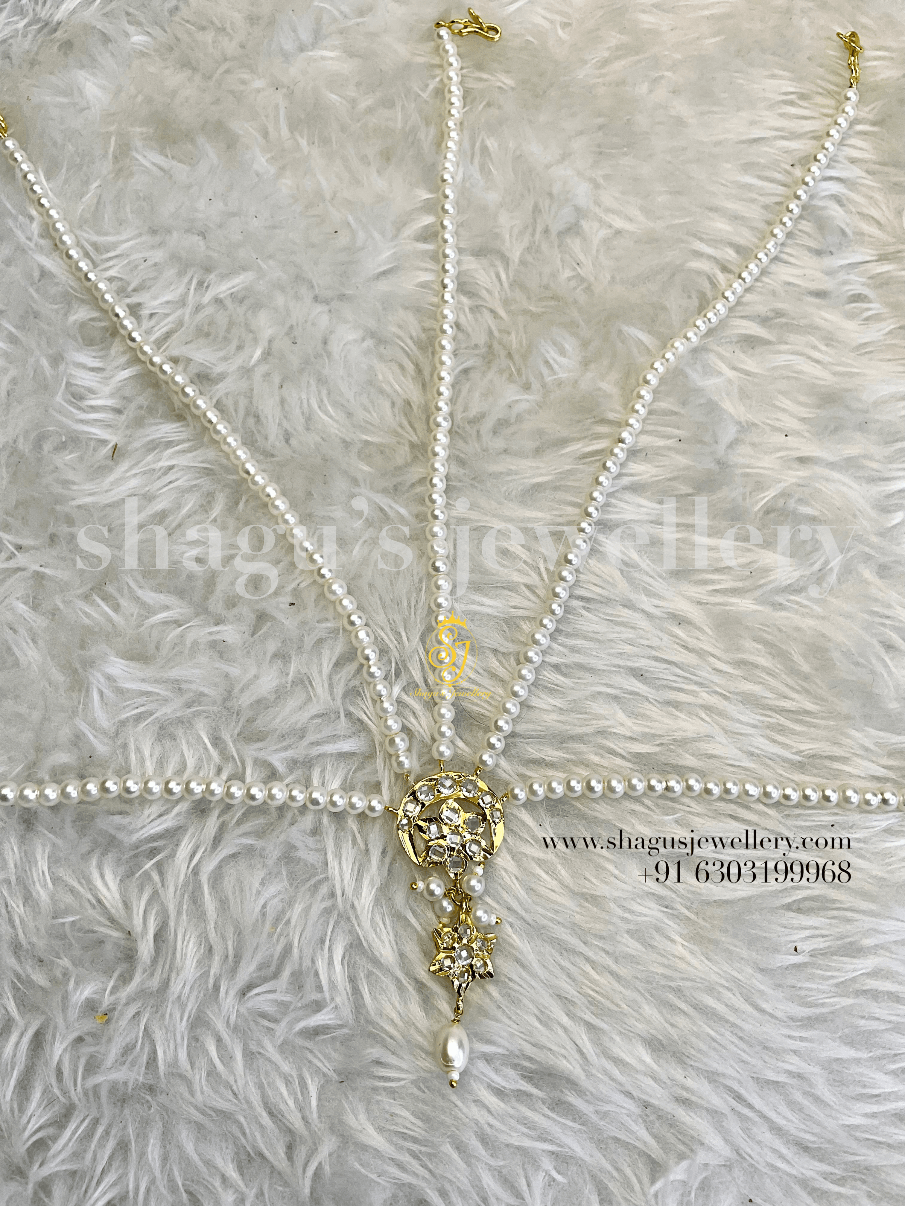 The pearl and 22k gold platted hair band is a trending fashion accessory that combines the elegance of pearls with the sophistication of gold. It features five strings of pearls arranged in a headband or mathapatti design, which adds a touch of luxury and glamour .